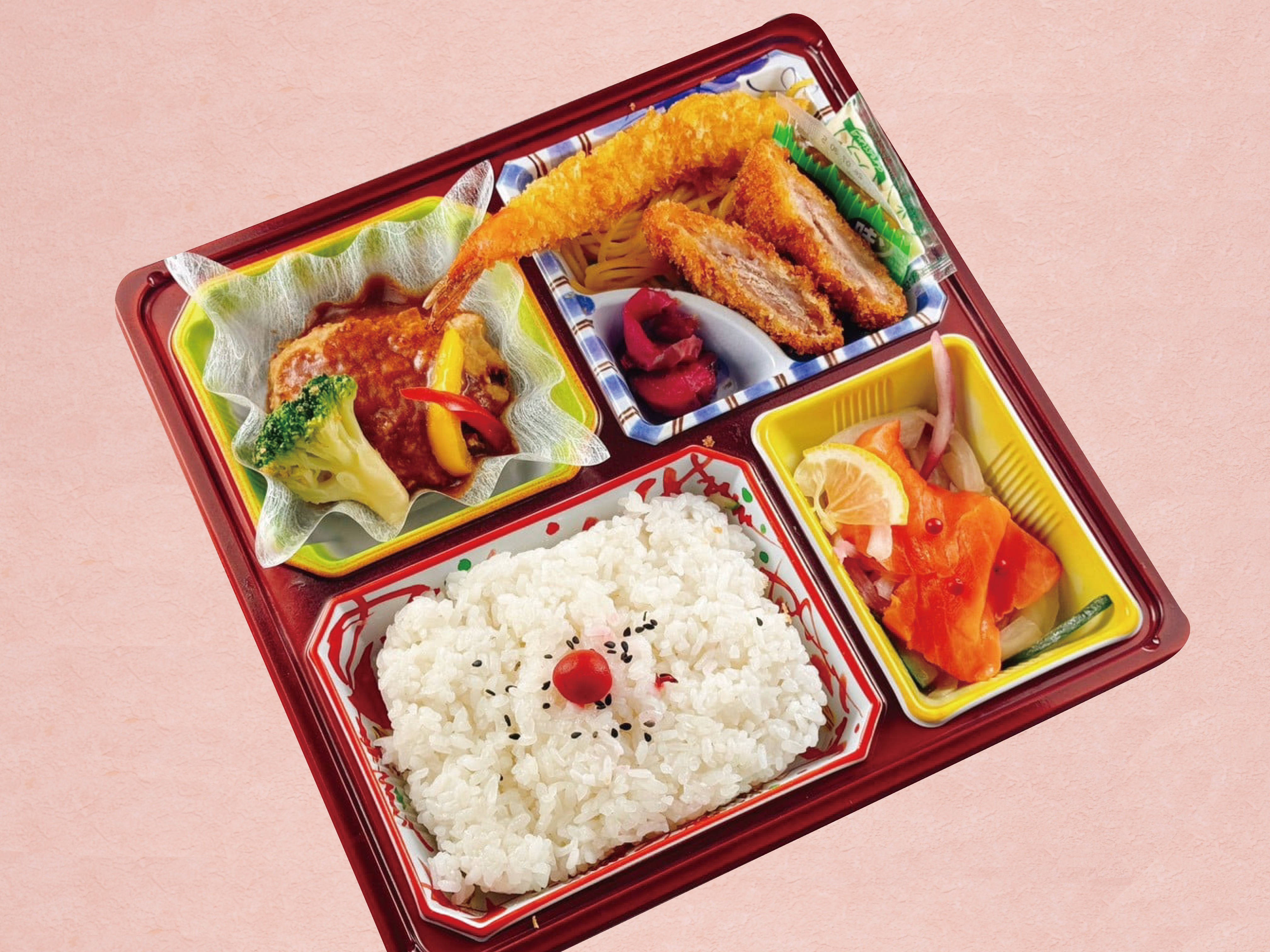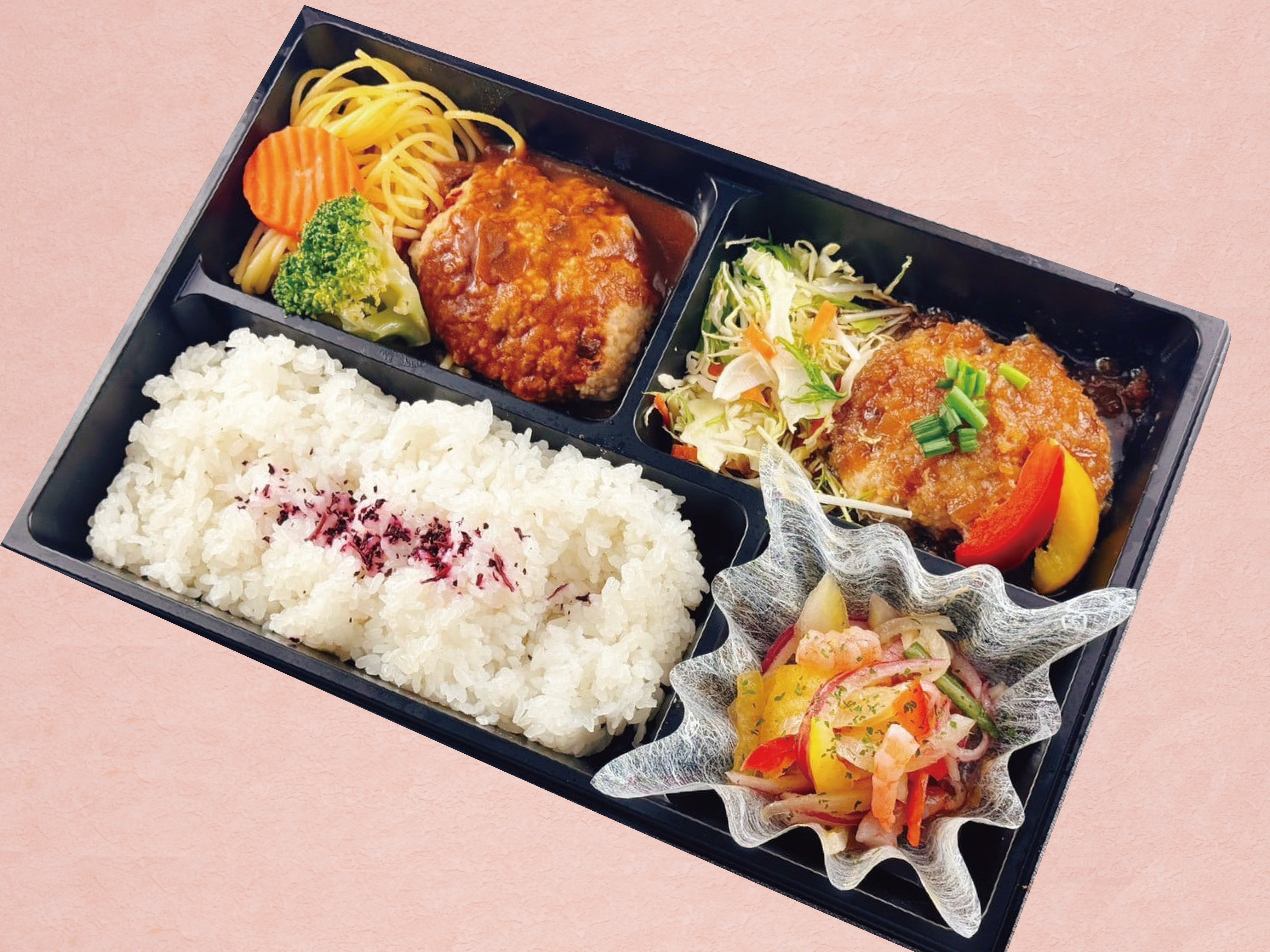 茨城県のブランド豚「常陸の輝き」と土浦レンコンを使ったハンバーグに海老フライやサーモンマリネなどが入った彩り豊かなお弁当です!