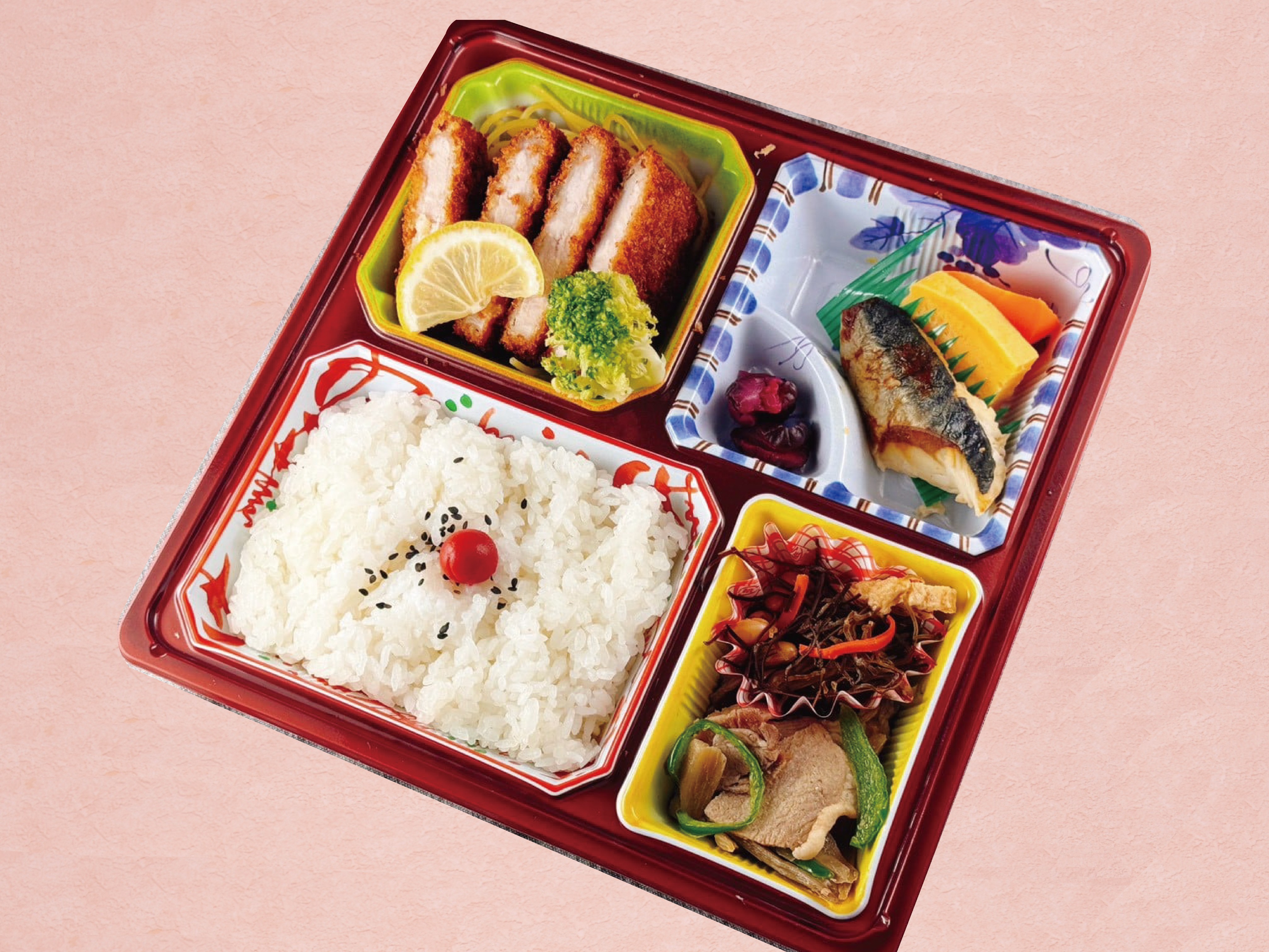 サイズ:24.0×24.0×4.0(cm)食べ応えのあるとんかつに、サバ塩こうじ焼き、煮物などが入ったお弁当です!
