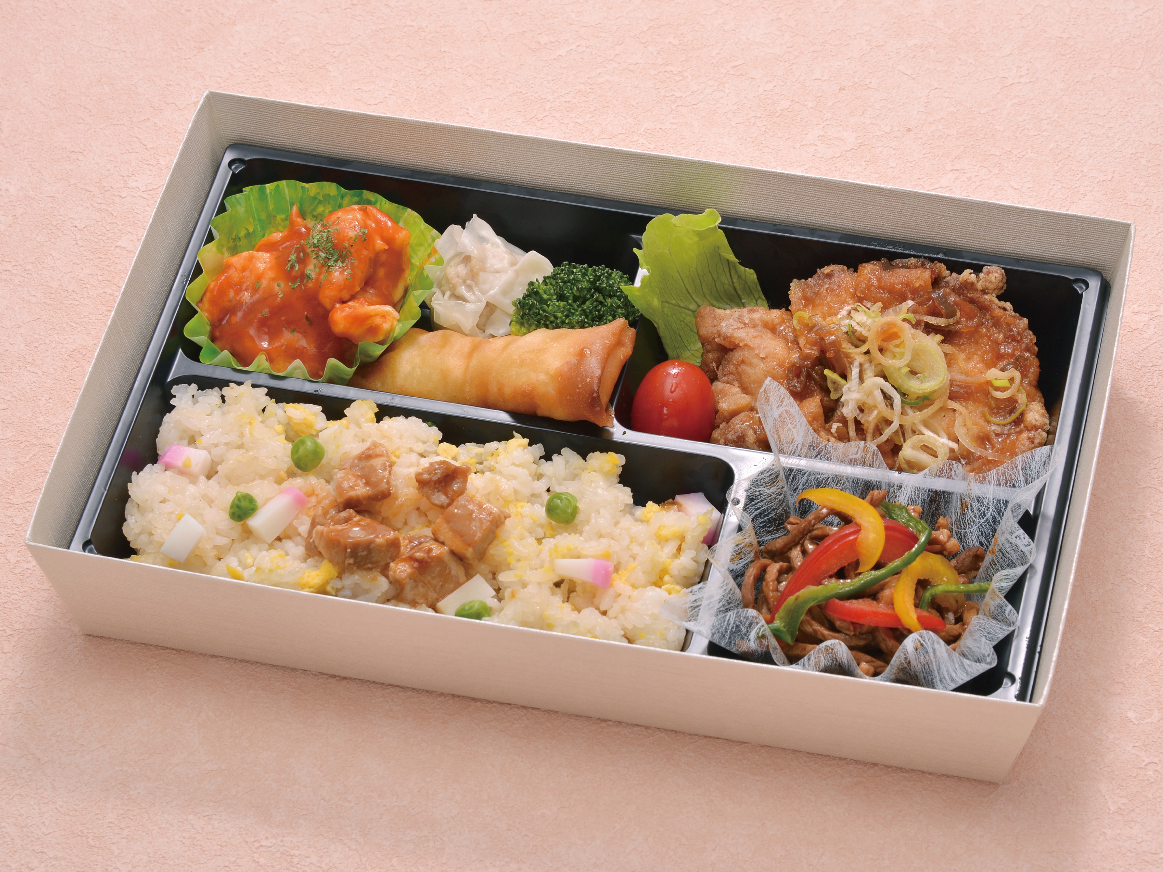 特製チャーハンにエビチリ、油淋鶏(ユーリンチー)、春巻きなどが入った食欲をそそる中華弁当です!