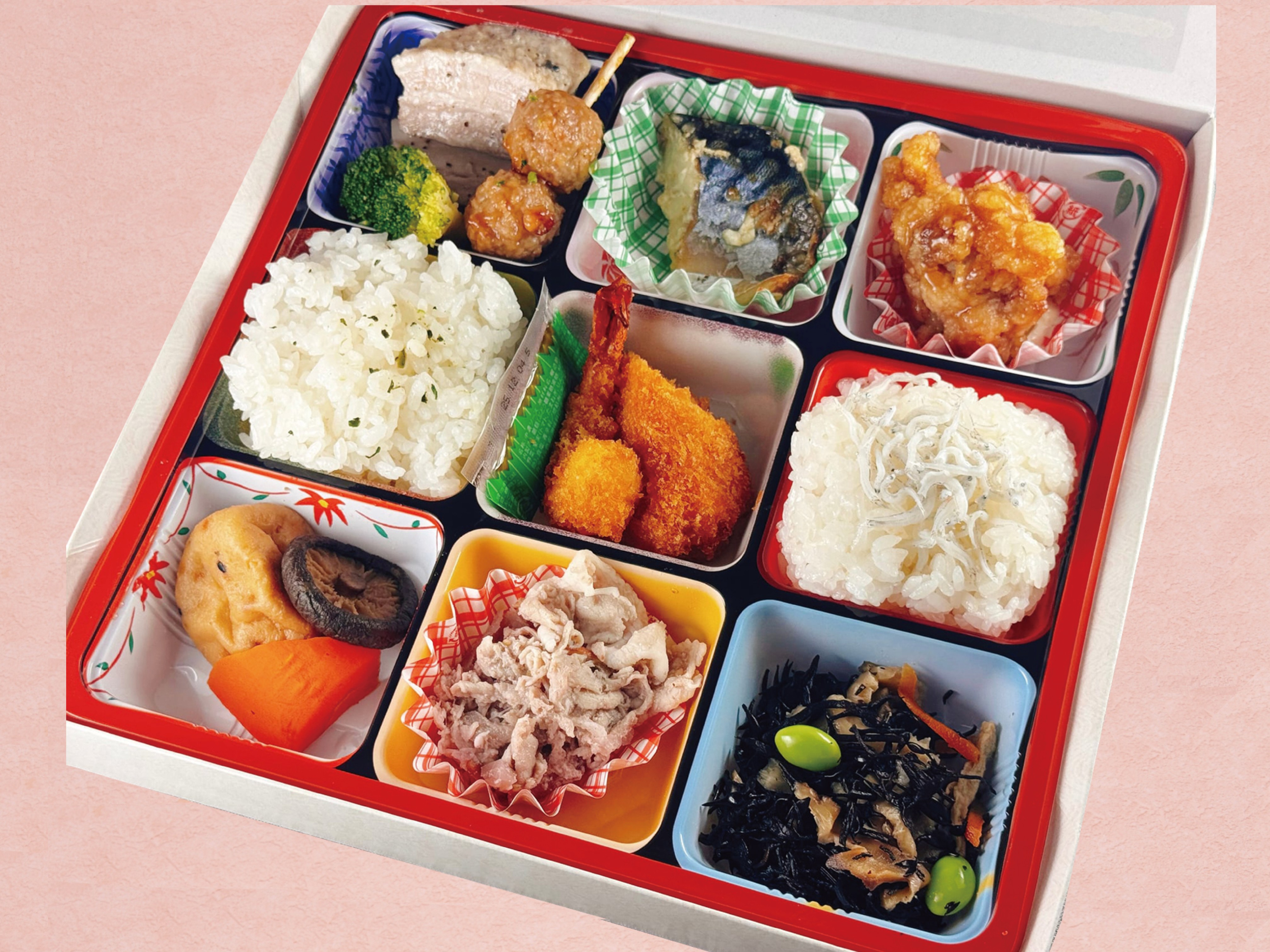 サイズ:24.0×24.0×4.0(cm)自家製ローストポーク、サバ塩こうじ焼き、エビフライなど多品種のおかずか嬉しい四季折々の素材を使用したお弁当です