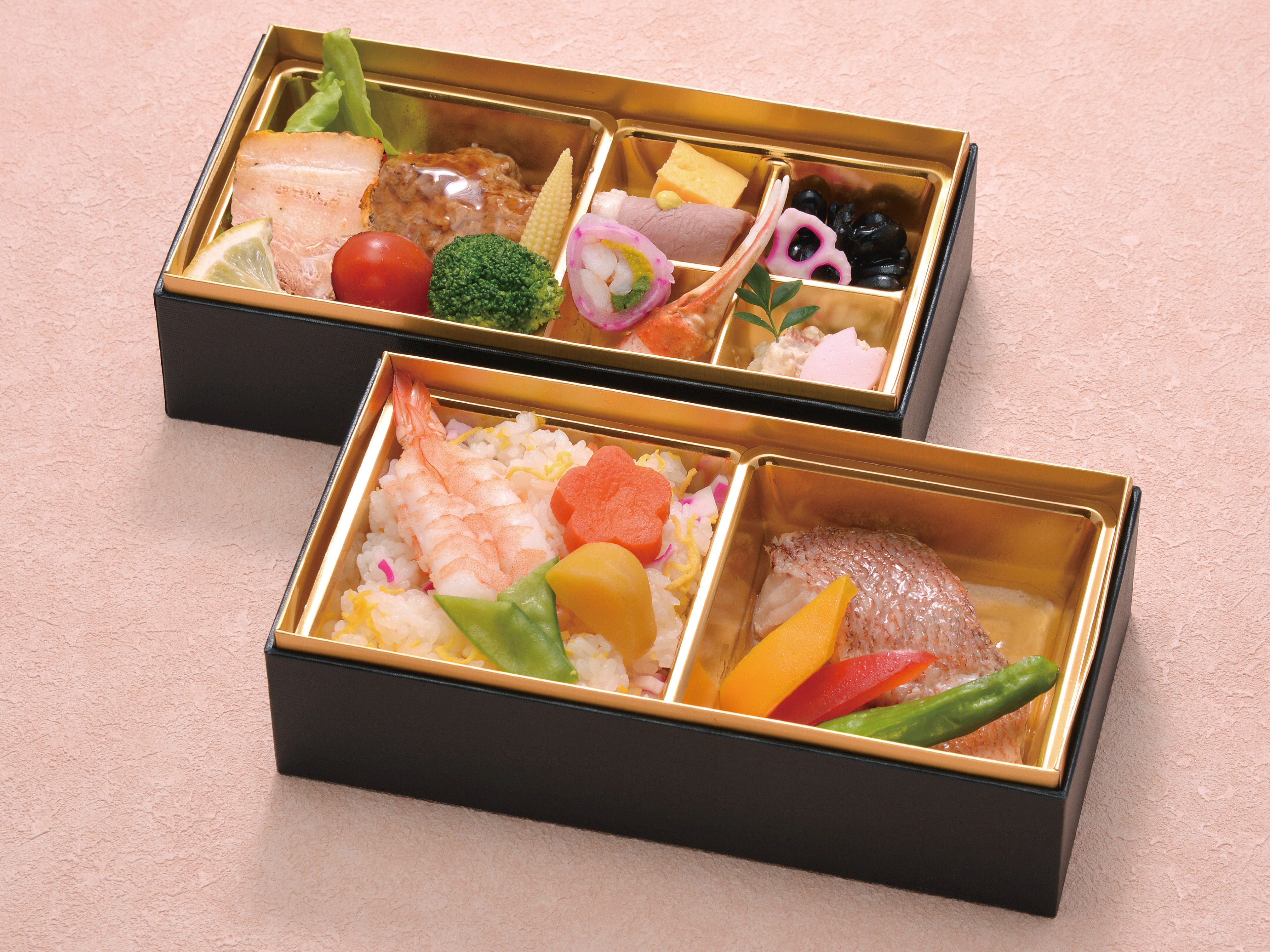 常陸牛ハンバーグ/ ローストポーク/ 蟹爪/赤魚生姜あん/ 鴨スモーク/ 炊き込みご飯などお祝いなどのご利用にもオススメの華やかな二段重のお弁当です!