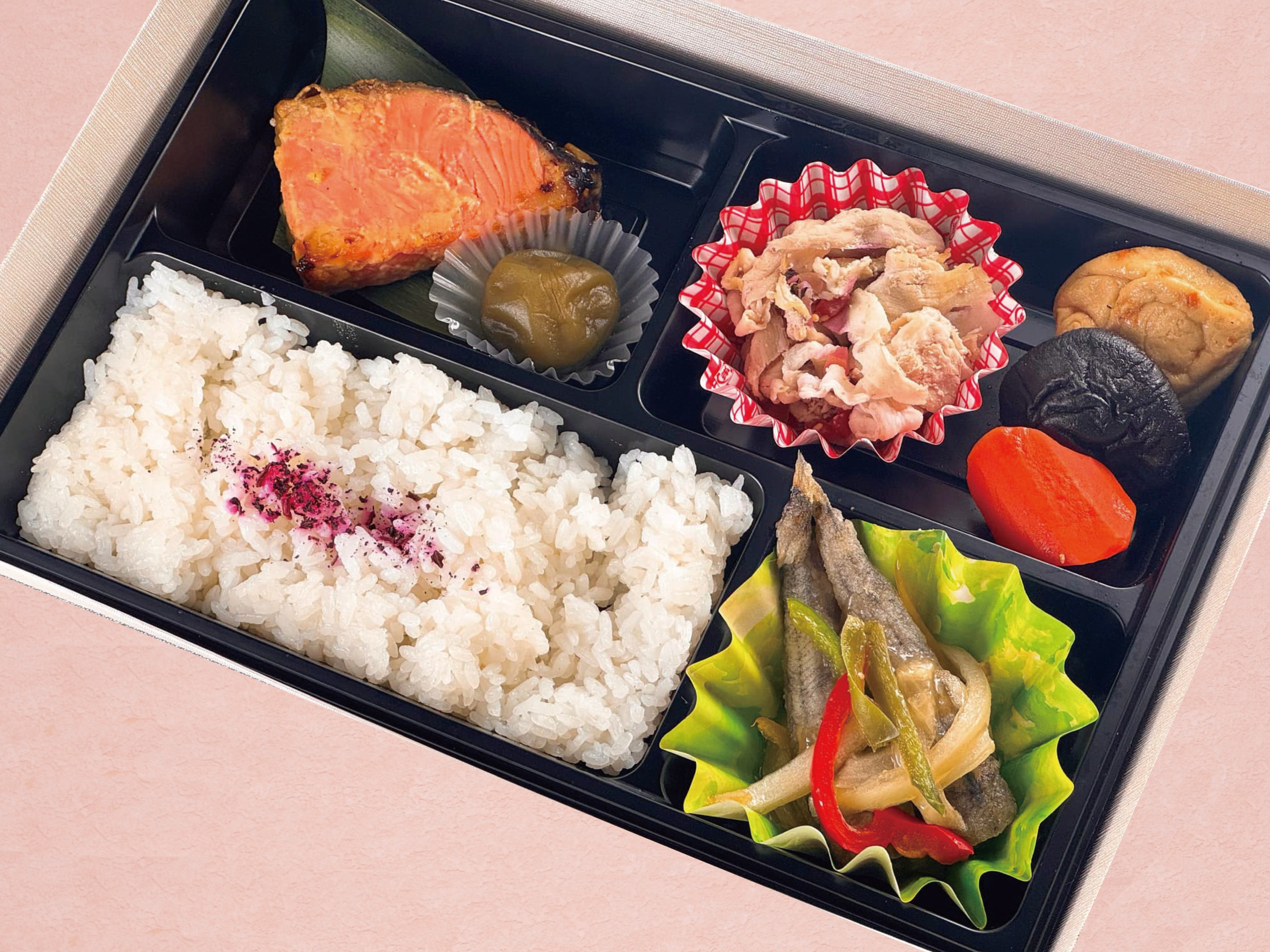 万年屋で人気の鮭の西京焼き、メヒカリ南蛮、茨城の梅甘露煮などが入ったお弁当です!